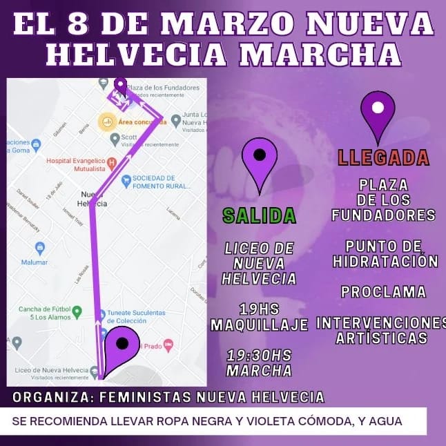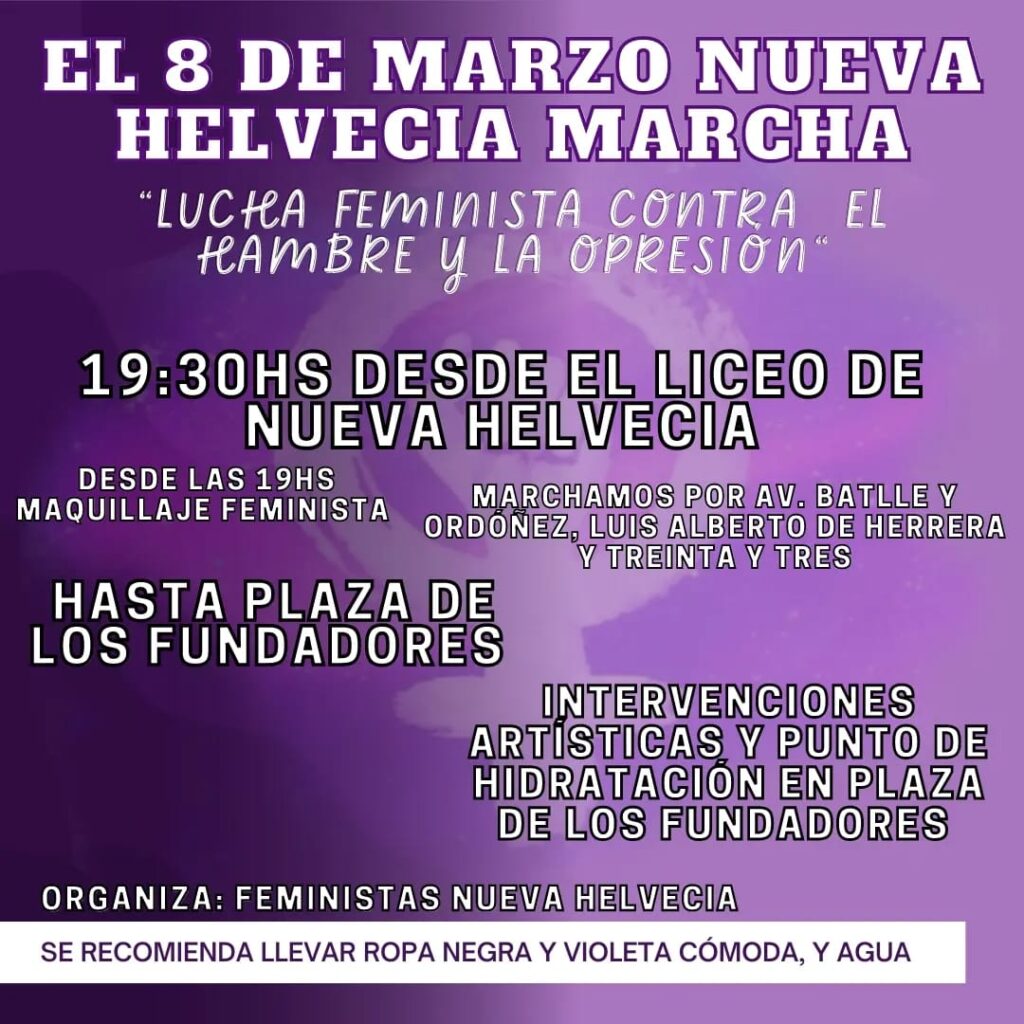 La agrupación «Feministas Nueva Helvecia» anuncia una nueva movilización en Nueva Helvecia para este miércoles 8 de marzo con motivo del Día de la Mujer.