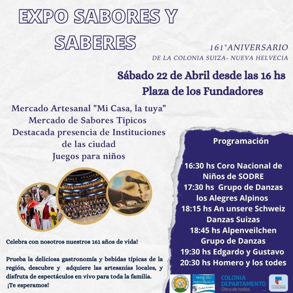 Sabores y Saberes tendrá lugar el próximo sábado 22 de abril en Plaza de los Fundadores, y es una oportunidad única para sumergirse en la cultura centro europea de Nueva Helvecia. ¡Te esperamos! No te pierdas la emocionante programación que hemos preparado para conmemorar los 161 años de la Colonia Suiza – Nueva Helvecia. Para más información, contacta a nuestras oficinas al 4554 6738.