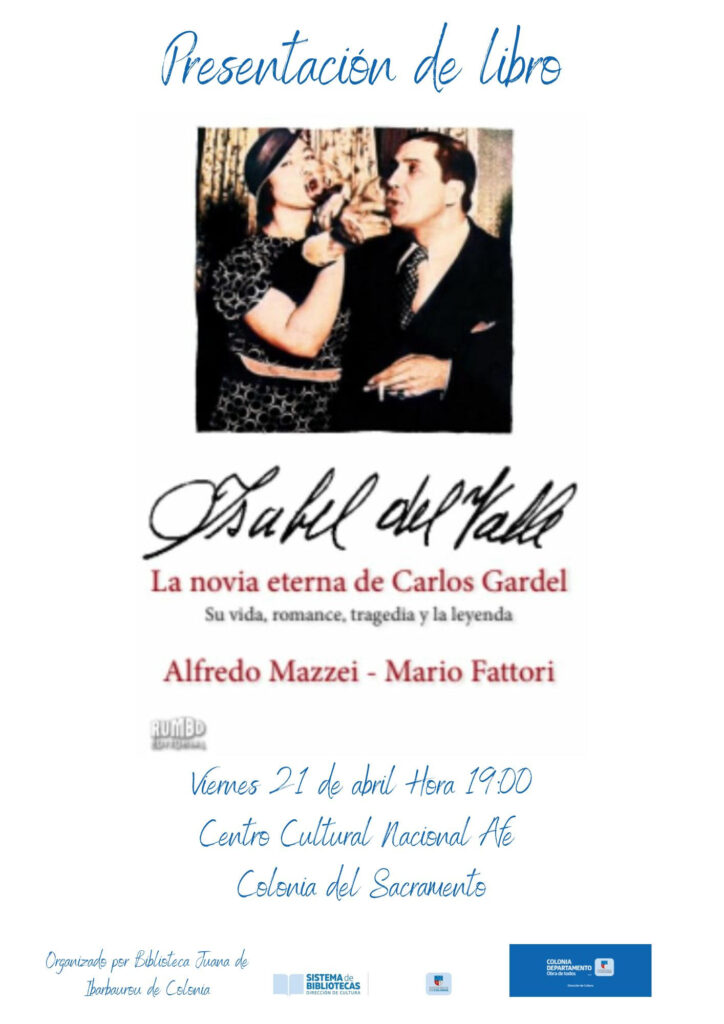 La Intendencia de Colonia a través de la Dirección de Cultura informa que, en el marco de la Semana del Tango, viernes 21 de abril, a la hora 19, en el Centro Cultural Nacional AFE de Colonia del Sacramento, previo al espectáculo «La Milonga de la Vía», la Biblioteca Central Juana de Ibarbourou realizará la presentación del libro «Isabel del Valle: La novia eterna de Gardel, su vida, romance, tragedia y leyenda»; con la presencia de sus autores Alfredo Mazzei y Mario Fattori.