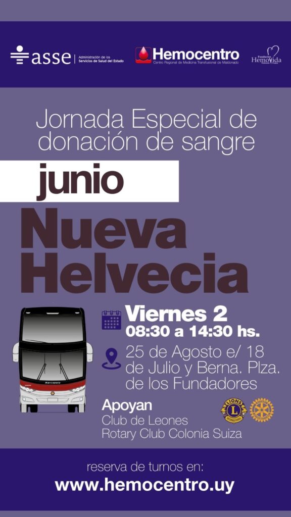 El Rotary Club de Colonia Suiza y el Club de Leones de Colonia Suiza, unen sus fuerzas para apoyar una Jornada de Donación de Sangre para el HEMOCENTRO de Maldonado y ASSE, que dispondrá el vital elemento así reunido, para uso de todas las instituciones médicas del país.