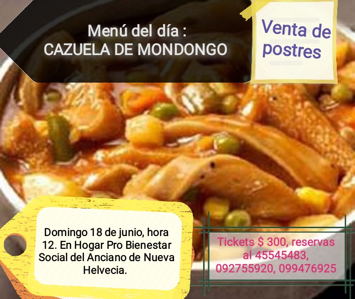 El Instituto Pro Bienestar Social del Anciano de Colonia Suiza anuncia su tradicional venta de cazuela de mondongo ya famosa por la cuidada elaboración y especial calidad.