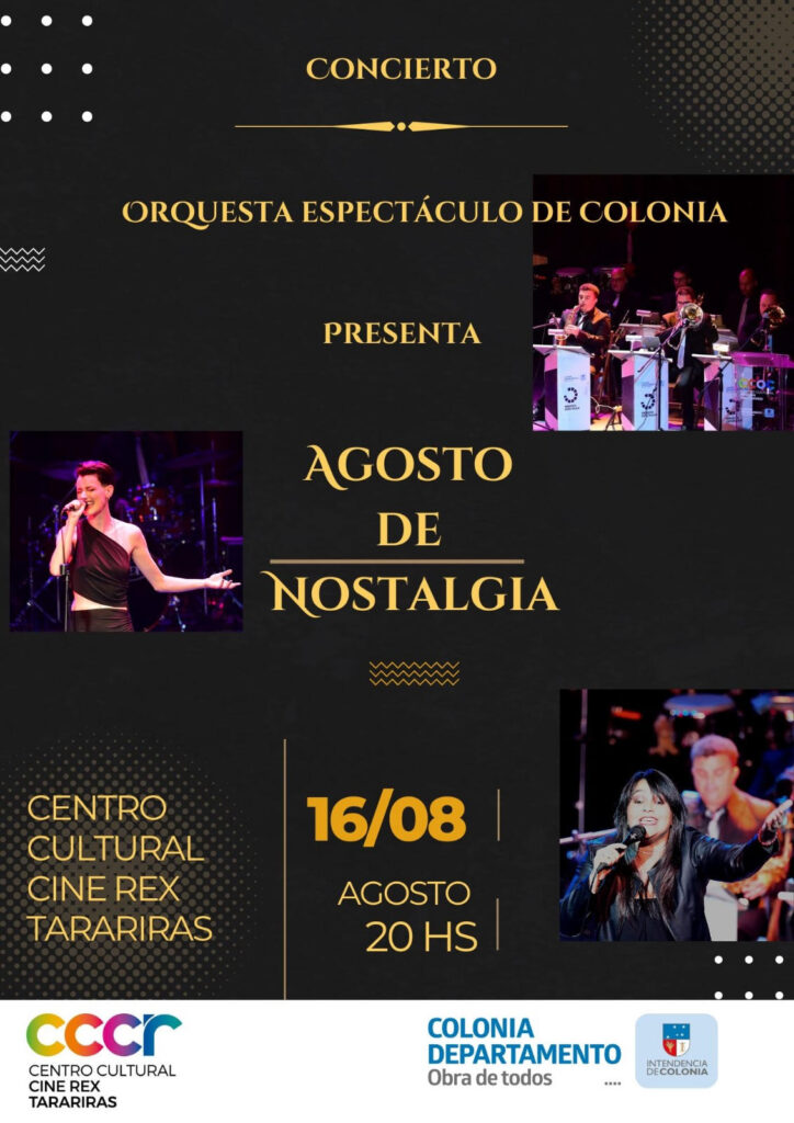 La Intendencia de Colonia a través de la Dirección de Cultura presenta a la Orquesta Espectáculo en el Concierto “AGOSTO DE NOSTALGIA», que se realizará el 2 y 16 de agosto en el Centro Cultural Bastión del Carmen de Colonia y Centro Cultural Cine Rex de Tarariras respectivamente.