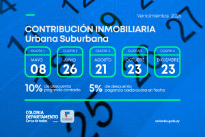 La Intendencia de Colonia a través del Departamento de Hacienda y Administración, informa el calendario de pago del Impuesto de Contribución Inmobiliaria Urbana y Sub Urbana, Ejercicio 2026.
